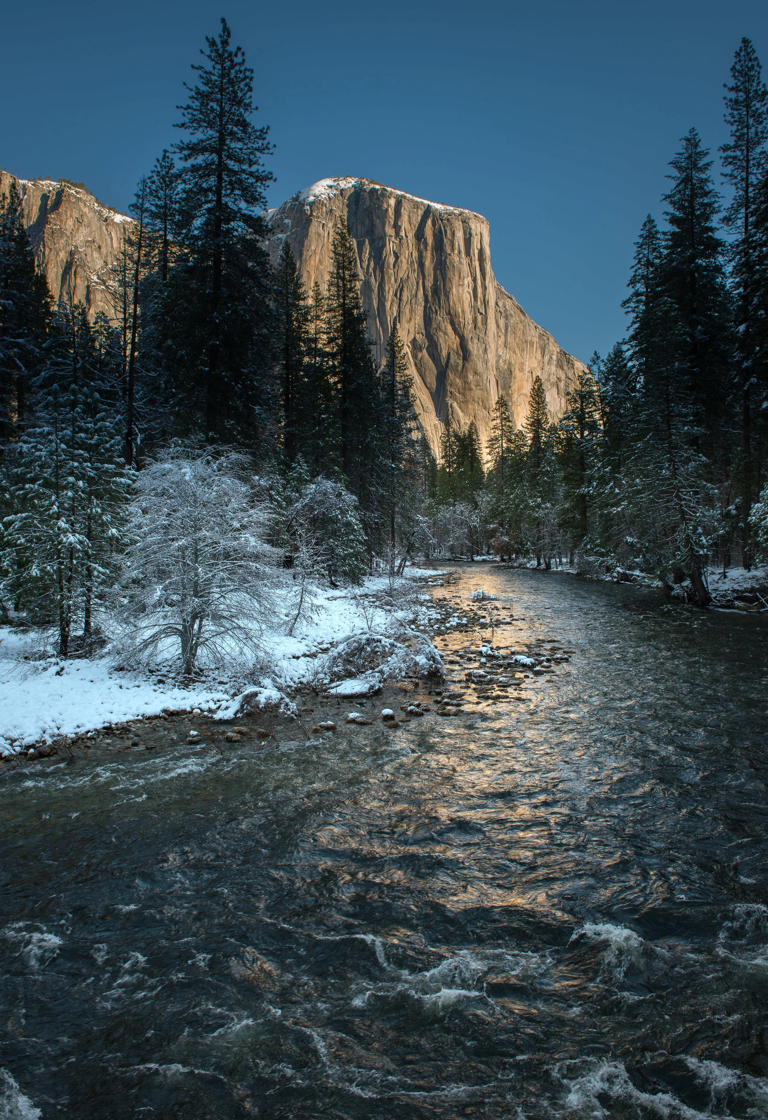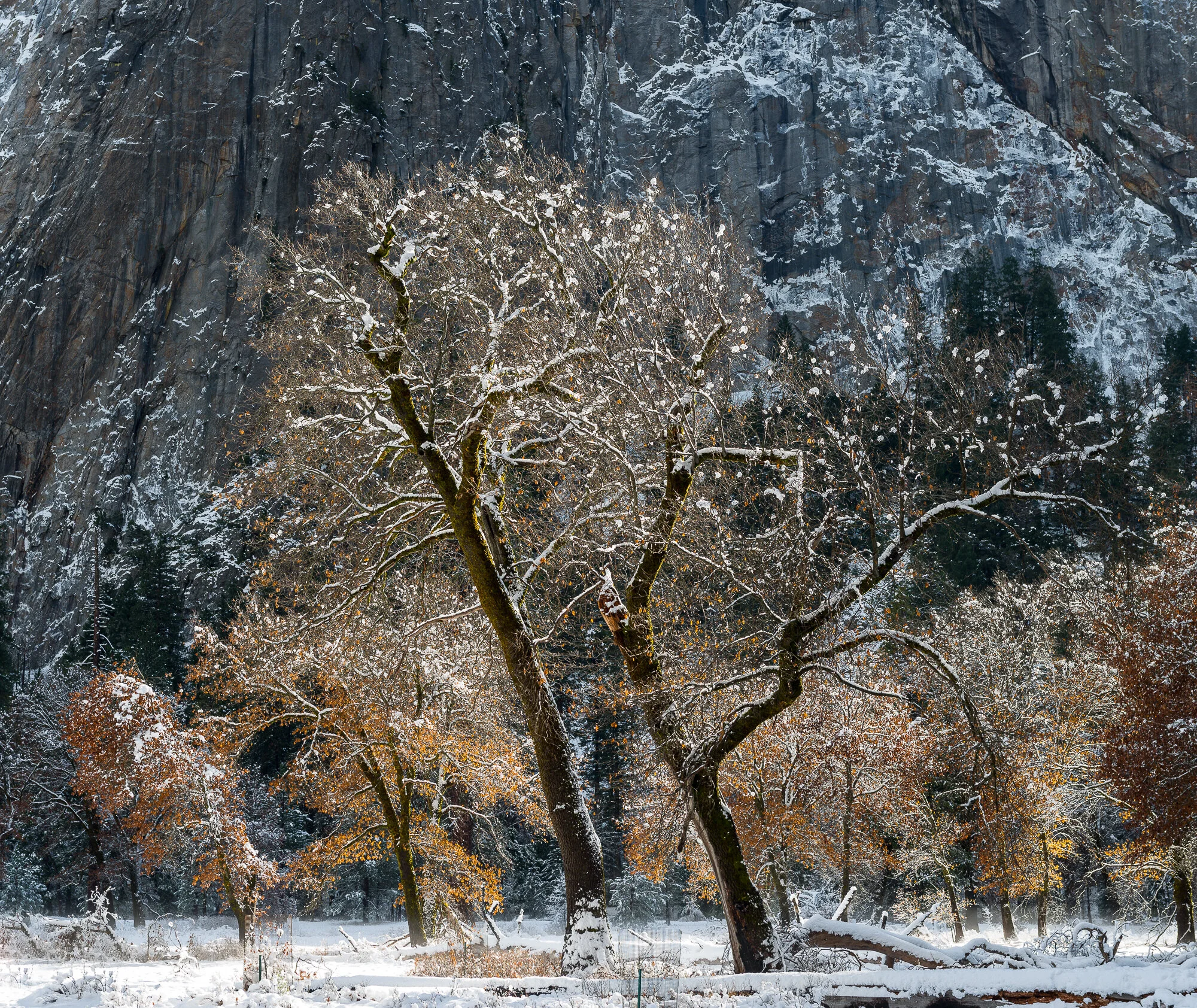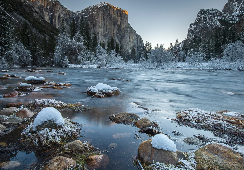 The mornings are often the best time to take photos in the winter as the hoar frost lingers on the branches of the trees and creates a crystal coating on the ground fauna. However, closer to sunset you often get fog setting in and this can lead to great images throughout the valley but mostly in the meadow areas at the east and west end of the valley. I try to avoid shooting in the middle of the day as the harsh light is difficult to control. However you can use El Capitan or other large granite faces to reflect the light and that reflected light is great for brining out detail in images.
